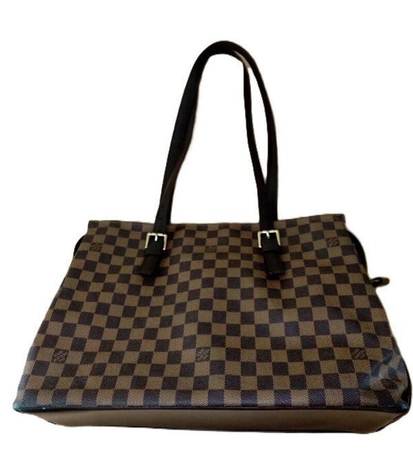 Stijlvolle Louis Vuitton Chelsea tote in het klassieke Damier Ebene canvas, afgewerkt met elegante lederen accenten. Ruim model met goudkleurige ritssluiting en praktisch binnenvakje. Perfect voor wie luxe en functionaliteit wil combineren.